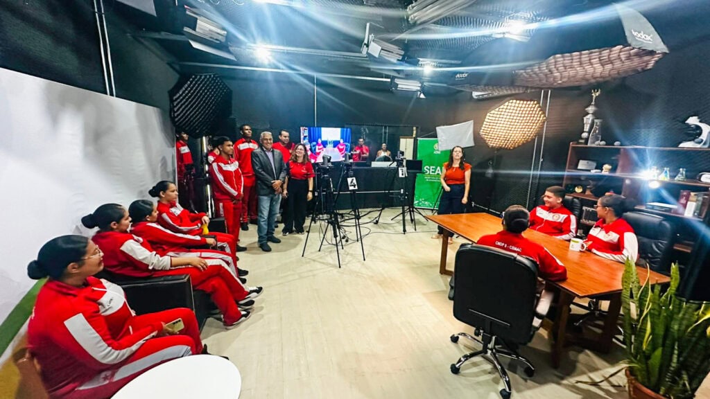 O Centro de Mídias Educacionais do Acre (Cemeac), unidade da Secretaria de Estado de Educação e Cultura (SEE), recebeu nesta semana estudantes da 3ª série do ensino médio do Colégio Militar Dom Pedro II, de Rio Branco. A visita integrou as atividades da disciplina de Rotas de Linguagens e teve como objetivo proporcionar aos alunos uma vivência prática sobre o funcionamento de estúdios profissionais de comunicação.