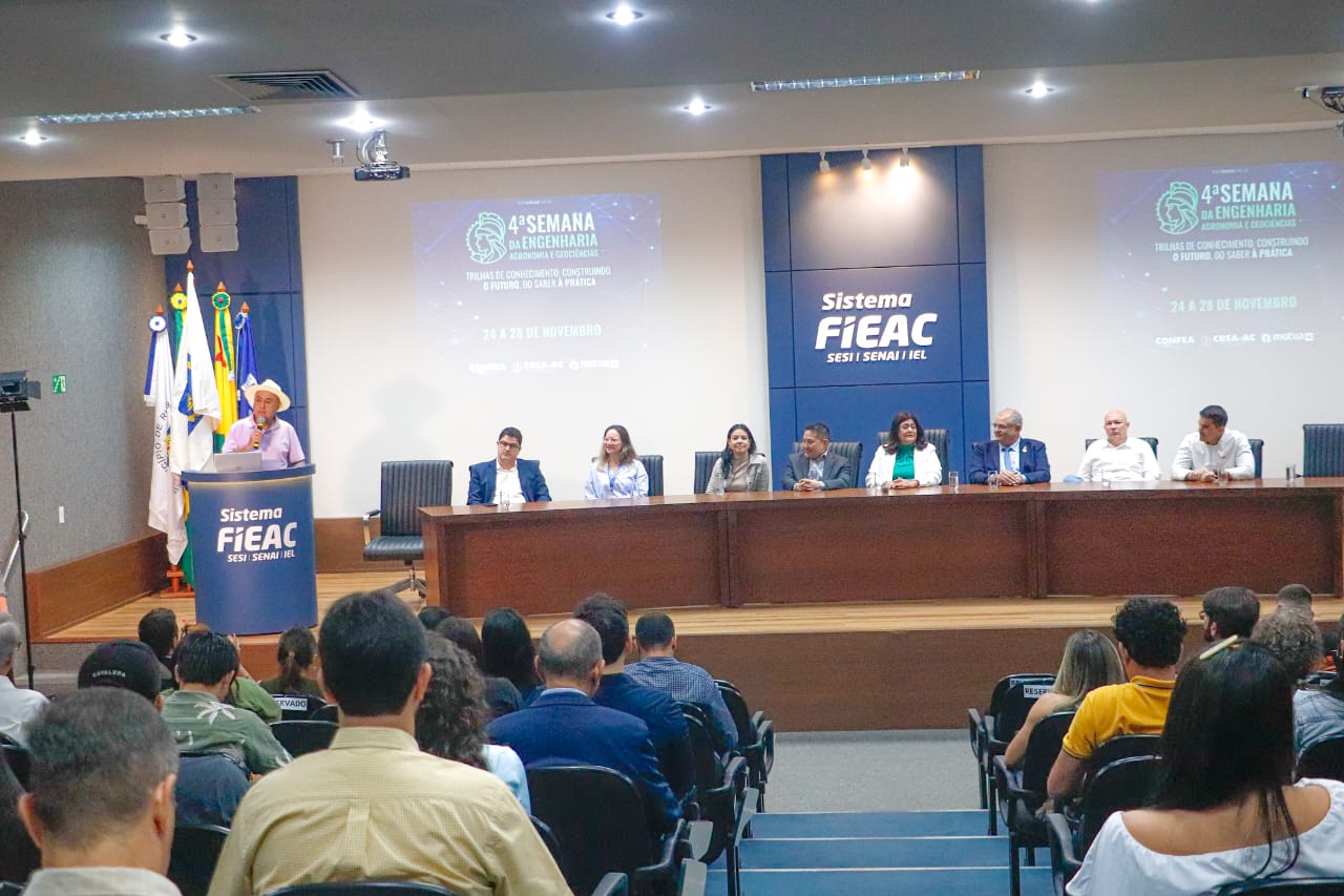 A 4ª Semana de Engenharia, Agronomia e Geociências, promovida pelo Conselho Regional de Engenharia e Agronomia do Acre (CREA-AC) e instituições parceiras, foi oficialmente aberta na noite dessa segunda-feira (24), no auditório da FIEAC. O evento reuniu autoridades, empresários, engenheiros e estudantes, reforçando seu papel como espaço estratégico de atualização profissional e integração entre academia e mercado.