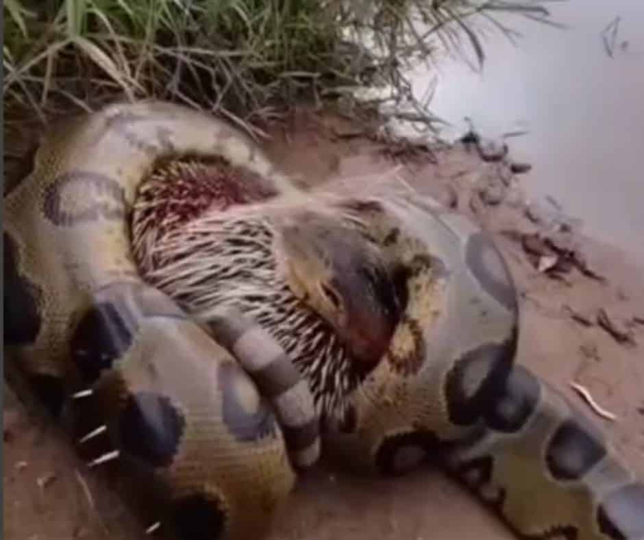 Os porcos-espinhos possuem o corpo coberto por espinhos rígidos e extremamente pontiagudos, que funcionam como um mecanismo natural de defesa. Ao tentar engolir a presa, a sucuri acabou sendo ferida pelos espinhos, ficando com várias perfurações ao redor da boca e do corpo.