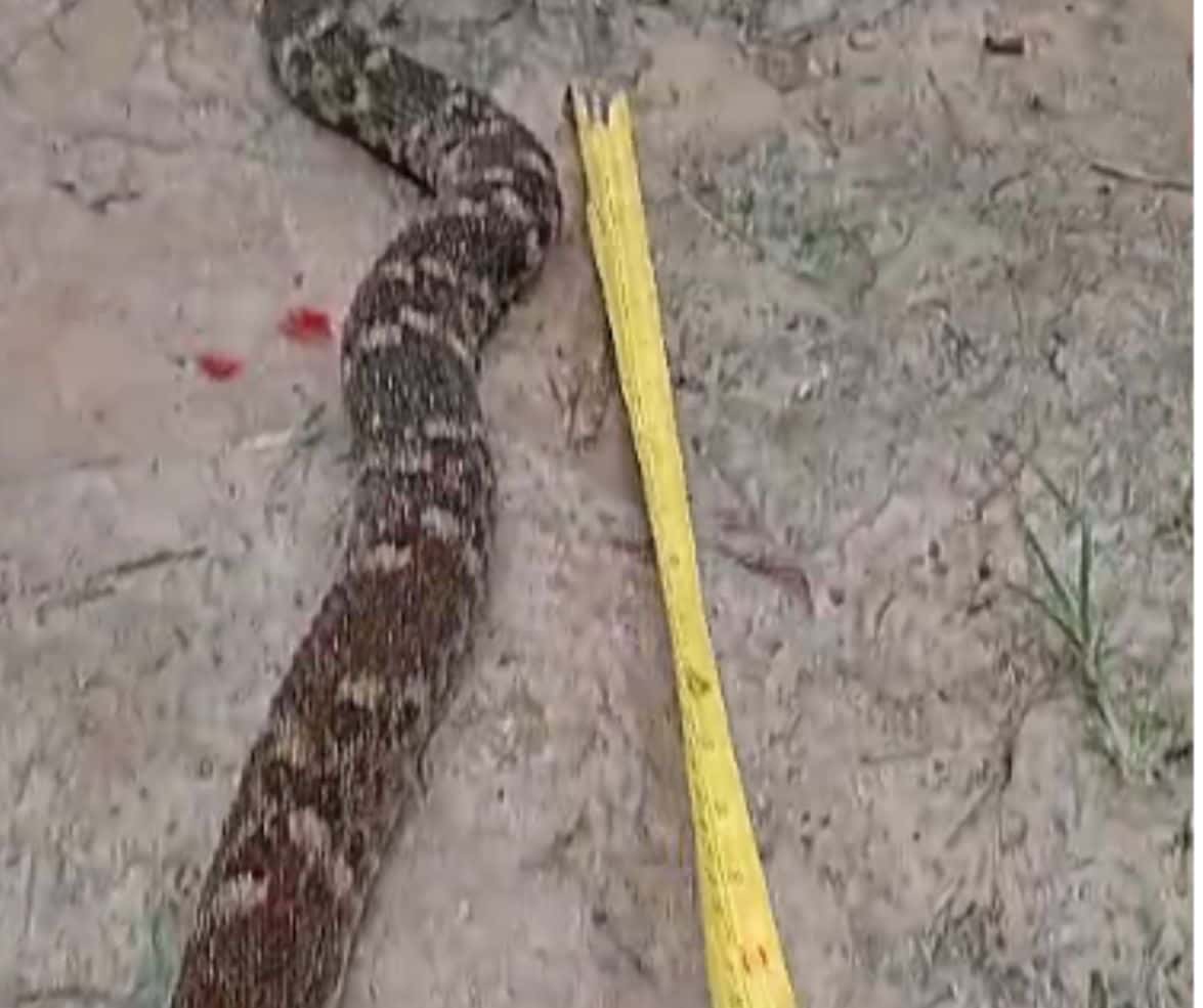 Após ser abatida, a cobra foi medida e tinha mais de um metro de comprimento. O caso serve de alerta para que moradores redobrem os cuidados, principalmente durante a limpeza de áreas com mato, onde esses animais costumam se esconder.