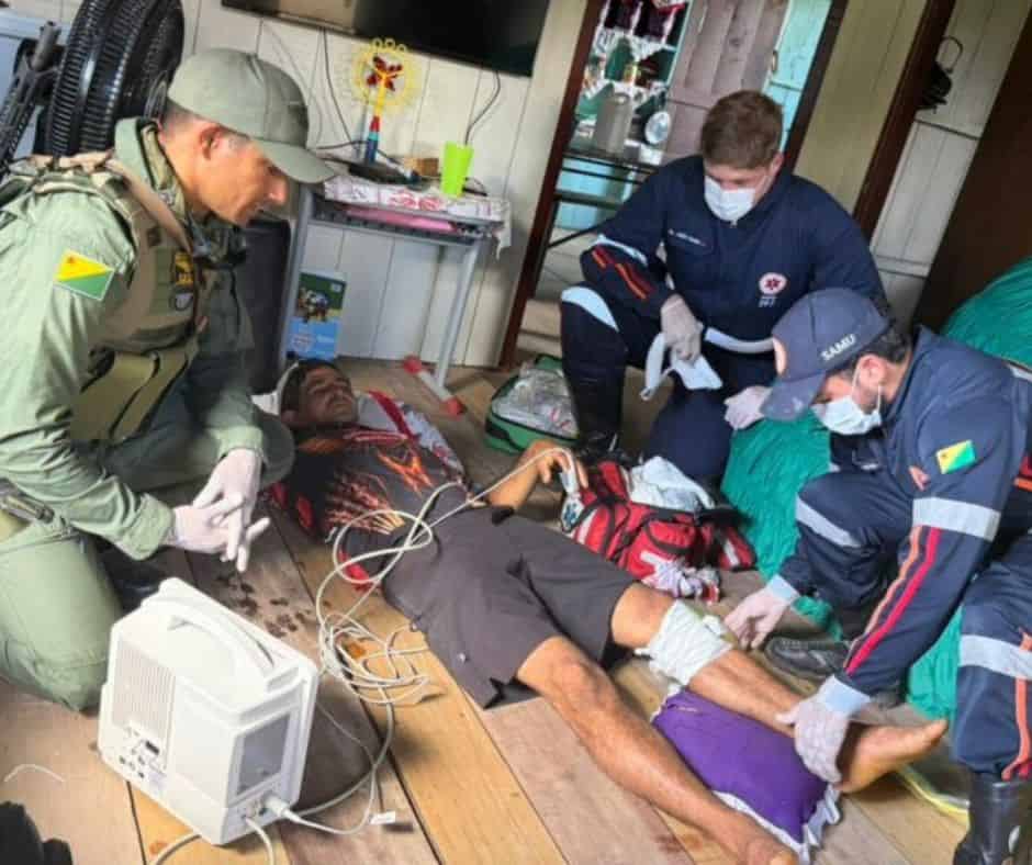 A equipe médica realizou os primeiros atendimentos ainda na comunidade e, em seguida, o paciente foi transportado de helicóptero até Cruzeiro do Sul. De lá, ele foi encaminhado ao Hospital do Juruá.