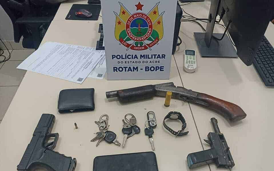 Policiais militares da Rondas ostensivas tático móvel (Rotam), do Batalhão de operações especiais (Bope), apreenderam duas armas de fogo, um simulacro e recuperaram um veículo, no...