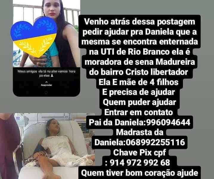 Mãe de família residente em Sena Madureira está internado na UTI em Rio Branco, e precisa muito de sua ajuda confira o pedido abaixo. Por Ronaldo...