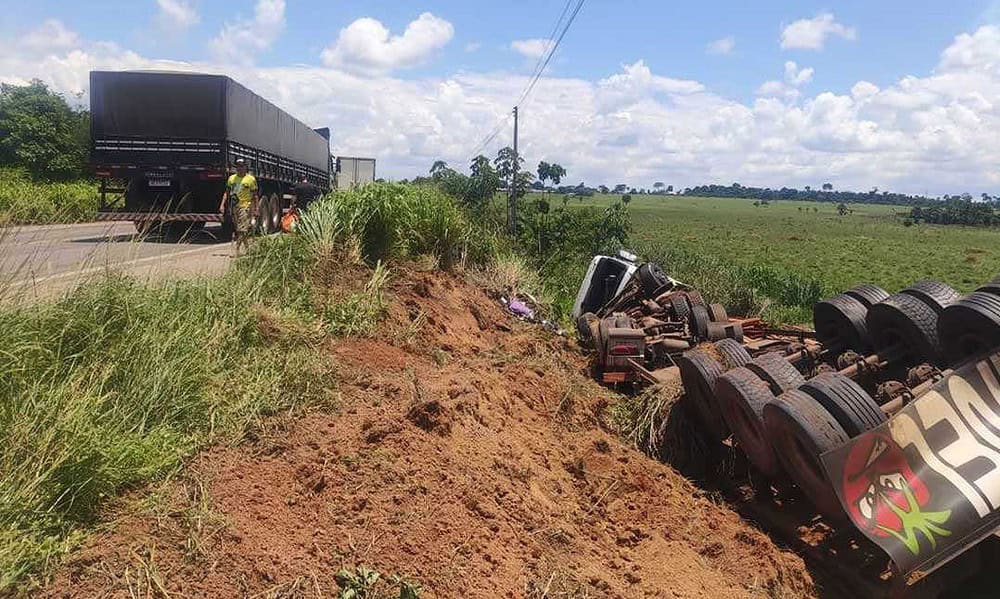 Uma carreta saiu da pista e tombou