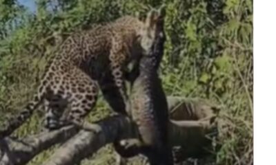 Uma onça-pintada foi flagrada em uma impressionante cena de caça ao capturar um jacaré-preto de mais de 80 quilos em um lago no Maranhão. Após dominar...