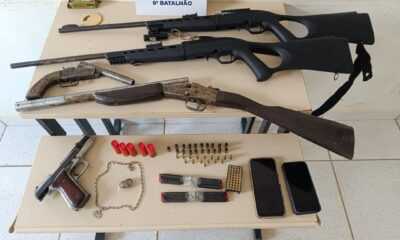 Policiais militares do 8° Batalhão apreenderam cinco armas de fogo além de munições e prenderam os envolvidos, dentre eles um menor foi apreendido, na segunda-feira, 21,...